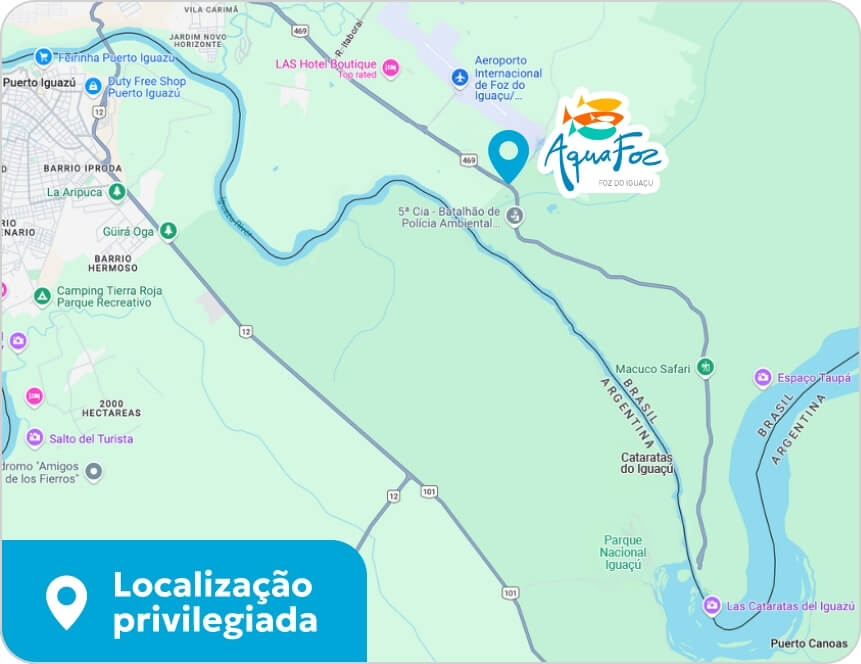 O AquaFoz está localizado em Foz do Iguaçu, à frente do Parque Nacional do Iguaçu. Você pode chegar de carro, agências de receptivo turístico, transporte público ou serviços de transporte por aplicativo. Consulte o mapa e as opções de transporte no site oficial.